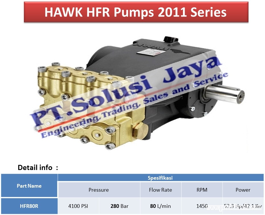 - Kinerja: 280 Bar / 4100 Psi, 80 L / M Pompa Hawk HFR 280 R